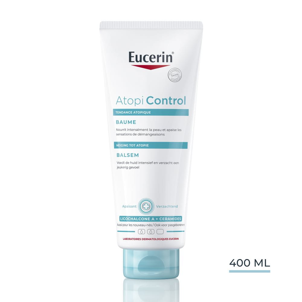 Le Baume AtopiControl d’Eucerin est un baume corporel d’usage quotidien qui a été spécialement formulé pour apaiser et hydrater intensément les peaux avec sensations d’irritation et de démangeaison. Le baume huile-dans-eau, léger mais nourrissant, contient de la Licochalcone A apaisante, des Céramides et du Beurre de Karité pour renforcer la barrière cutanée et soulager la sécheresse et les sensations de démangeaison. Il peut également être utilisé comme soin hydratant en même temps que la Crème Calmante Intensive et votre traitement médical habituel. (consulter un médecin avant utilisation avec des médicaments topiques). Le baume pour la peau sujette à l’eczéma atopique fournit une hydratation instantanée pour rendre la peau douce et lisse et, avec une application régulière, l’état de la peau s’améliore sensiblement.