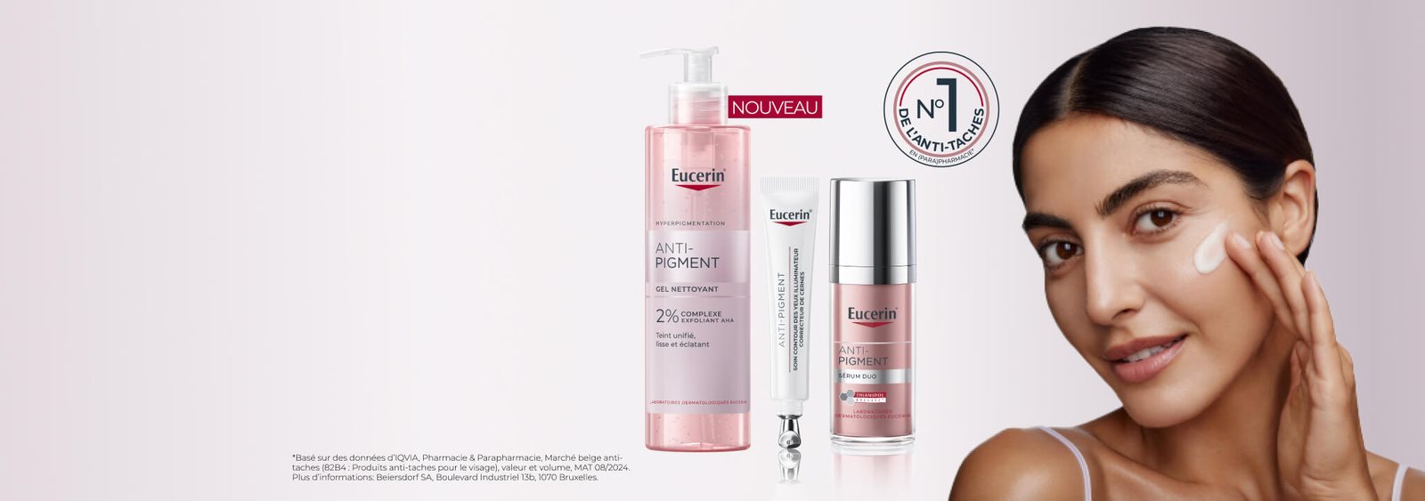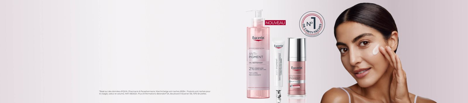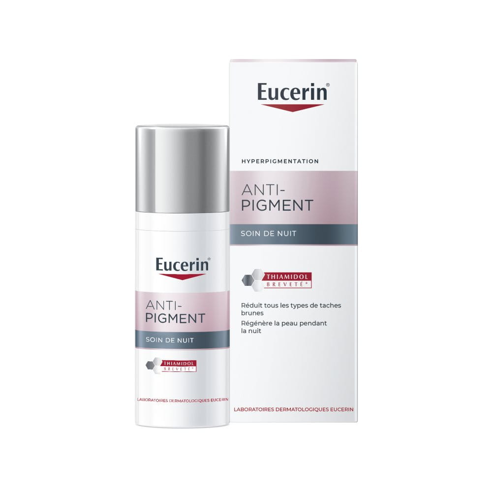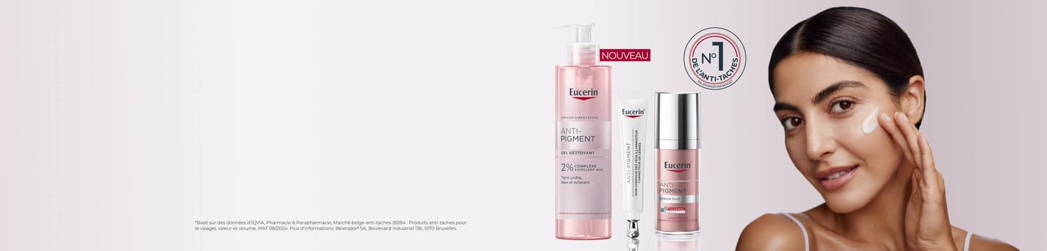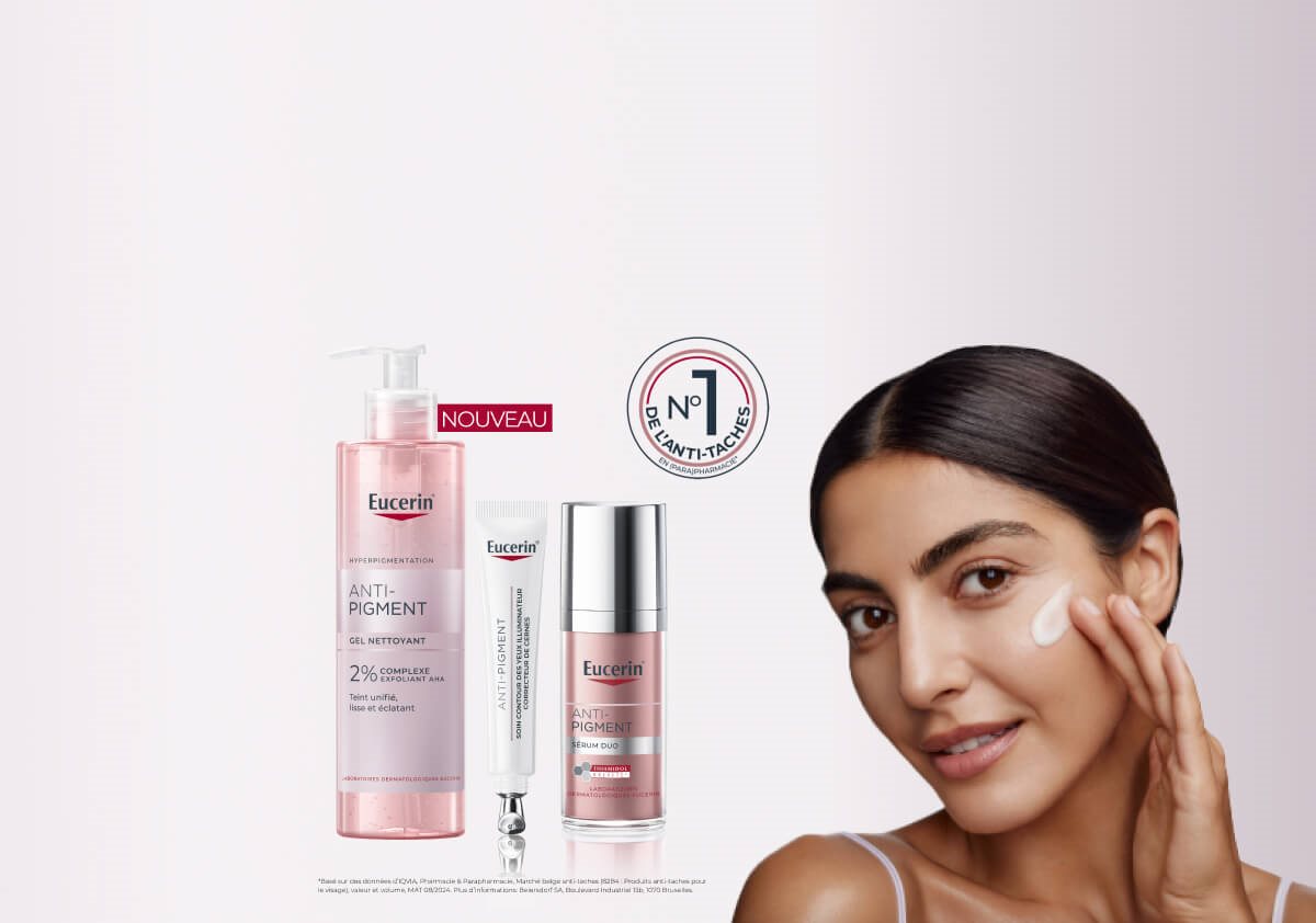 L’exposition au soleil, les facteurs hormonaux (tels que la grossesse et la ménopause) et le vieillissement cutané peuvent provoquer une hyperpigmentation : les taches pigmentaires et les taches de vieillesse (aussi appelées taches solaires) donnent à la peau un aspect irrégulier. La gamme de soins Eucerin Anti-Pigment a été spécialement formulée pour réduire les taches pigmentaires, pour un teint plus unifié et éclatant.