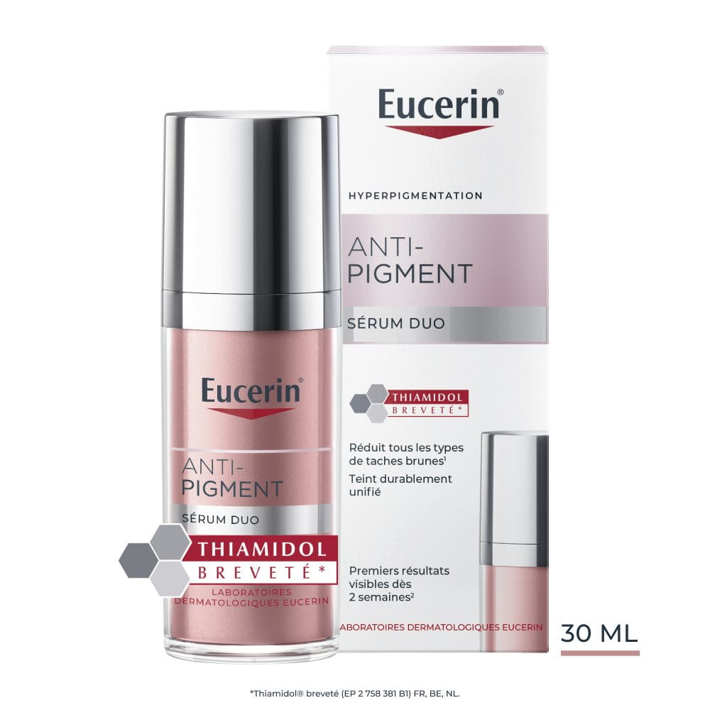 Le Double Sérum Eucerin Anti-Pigment associe deux sérums contenant chacun un principe actif principal qui agit de manière différente: