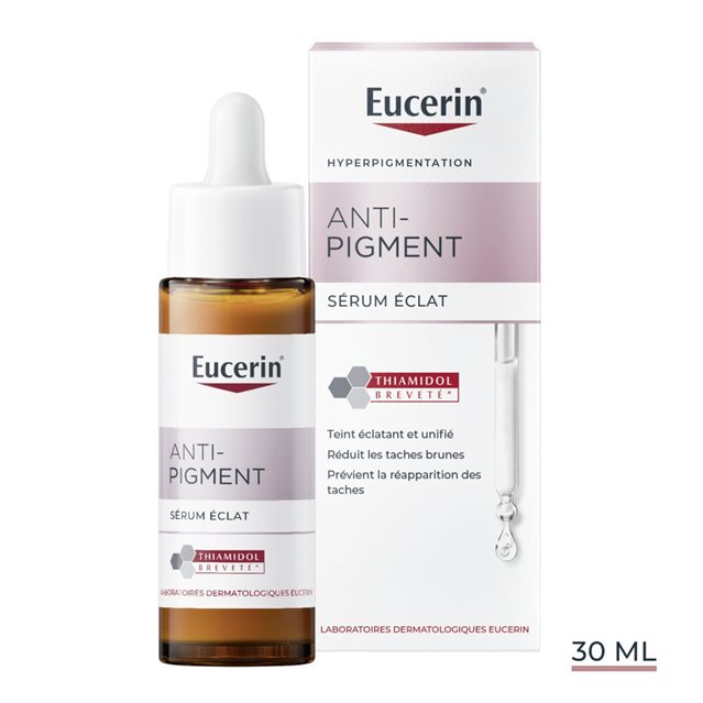 La mélanine est un pigment naturel qui détermine la couleur de la peau. L’exposition au soleil, les facteurs hormonaux et le vieillissement cutané peuvent conduire à une augmentation de la production de mélanine et déclencher une hyperpigmentation. L’hyperpigmentation se manifeste sous forme de taches brunes, de taches pigmentaires ou de taches de vieillesse (aussi appelées taches solaires) et donne à la peau un aspect irrégulier. Le Sérum Éclat Anti-Pigment d'Eucerin contient une combinaison d'ingrédients actifs puissants qui agissent de différentes façons pour promouvoir l'éclat de votre peau et réduire les taches de pigmentation à la source: