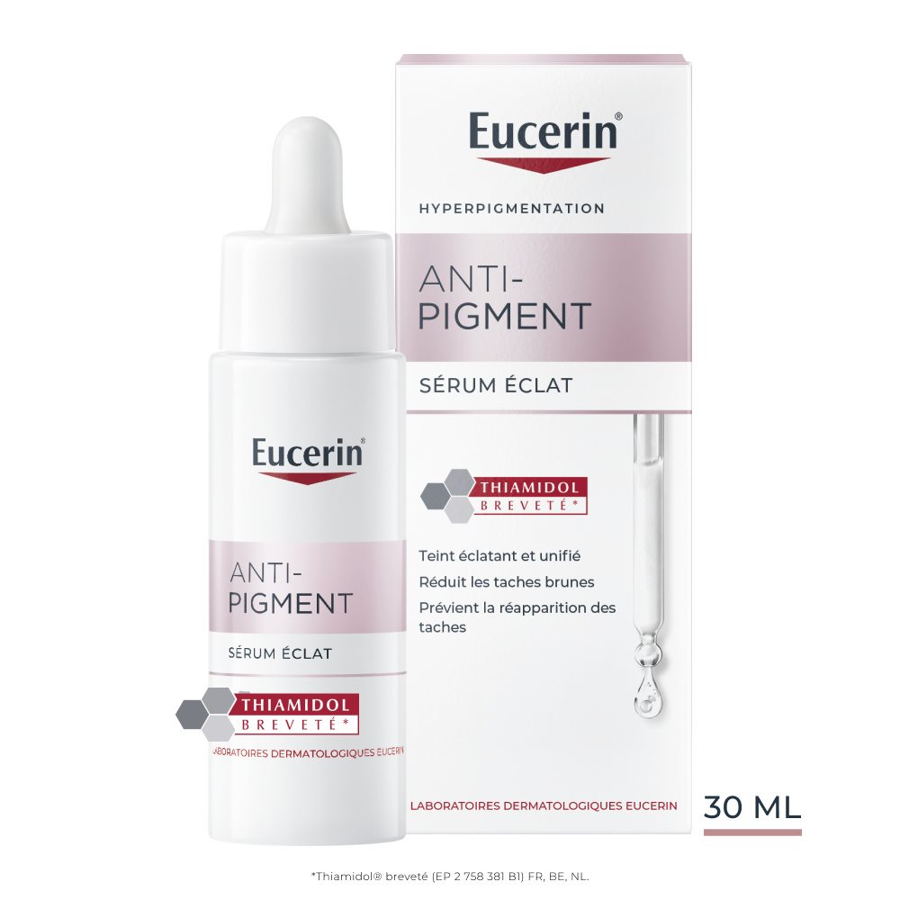 Le Sérum Éclat Anti-Pigment contient de l'Acide Hyaluronique concentré qui améliore l'hydratation de la peau. Il est efficace lorsqu'il est utilisé seul, ou dans le cadre de votre routine de soin habituelle, en parallèle à d'autres produits de la gamme Eucerin Anti-Pigment.