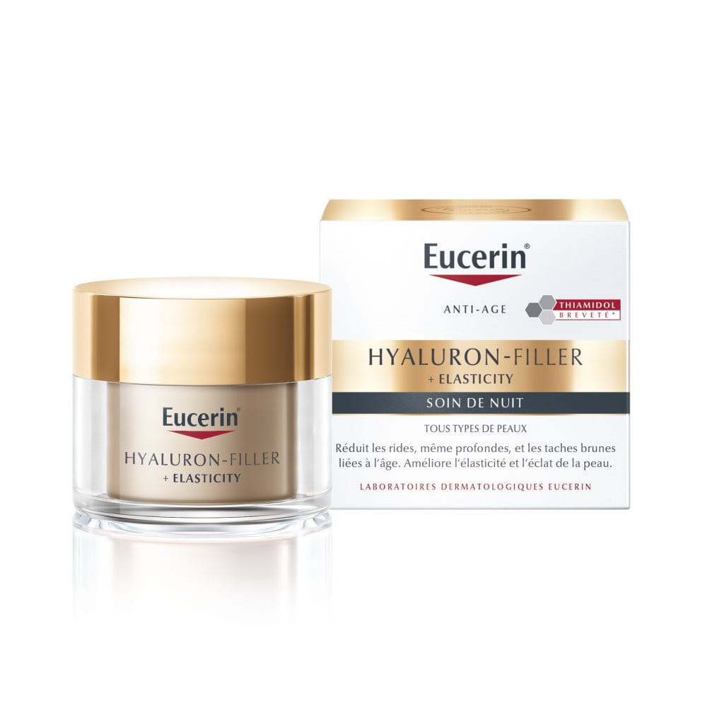 Le Soin de Nuit Hyaluron-Filler + Elasticity est une crème de nuit anti-âge qui comble les rides profondes, améliore l'élasticité de la peau et réduit les taches liées à l'âge.