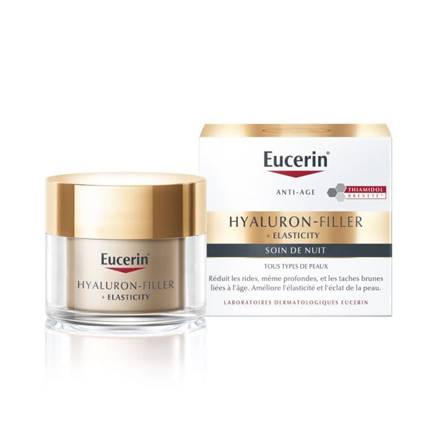 La formule unique offre de nombreux bénéfices anti-âge. Le mélange particulier d'Eucerin, contenant une association d'Acides Hyaluroniques de haut et bas poids moléculaire, comble visiblement les rides profondes tandis que le Dexpanthénol soutient le processus de régénération pendant la nuit. Le Complexe Collagène-Élastine, une combinaison d'Arctiine et de Créatine, stimule la production naturelle du collagène2 par la peau et améliore son élasticité. Le Thiamidol breveté1 d'Eucerin réduit l'apparence des taches de vieillesse. La peau paraît ferme et lisse, d'apparence fraîche et éclatante.