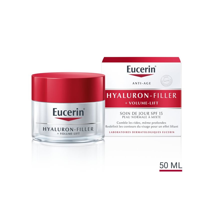 Au fil du temps, la peau perd de son volume et de sa fermeté : les contours du visage sont moins définis et les traits du visage changent visiblement. Le Soin de Jour Eucerin HYALURON-FILLER + VOLUME-LIFT a été spécialement formulé pour combler les rides profondes, redéfinir les contours du visage pour un effet liftant et protéger la peau normale à mixte du soleil. Cette crème de jour combine trois ingrédients actifs qui ciblent les couches spécifiques de la peau où se produit la perte de volume : le Magnolol augmente la taille et le nombre de cellules à l'origine du volume de la peau1, les Oligopeptides stimulent le réseau de collagène pour une structure de peau plus ferme1 et l’Acide Hyaluronique hydrate intensément la peau et comble les rides profondes. Avec une utilisation régulière, le Soin de Jour Eucerin HYALURON-FILLER + VOLUME-LIFT aide à régénérer le volume perdu pour redéfinir les contours du visage. Les ridules et les rides profondes sont visiblement réduites et la peau est perceptiblement plus lisse et plus ferme. Avec une protection SPF 15 et UVA, la crème anti-âge aide également à prévenir le photovieillissement (vieillissement prématuré de la peau causé par le soleil) et l'accentuation des rides. 1 Études In vitro
