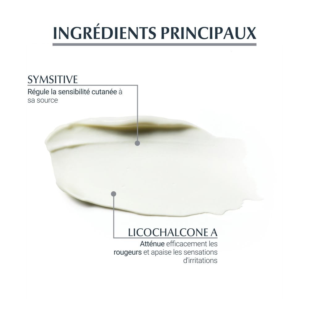 Cette formule combine 2 ingrédients actifs: la SymSitive* et la Licochalcone A. Symsitive* est un ingrédient actif innovant qui apaise les sensations d'inconfort et améliore le seuil de tolérance de la peau hypersensible.