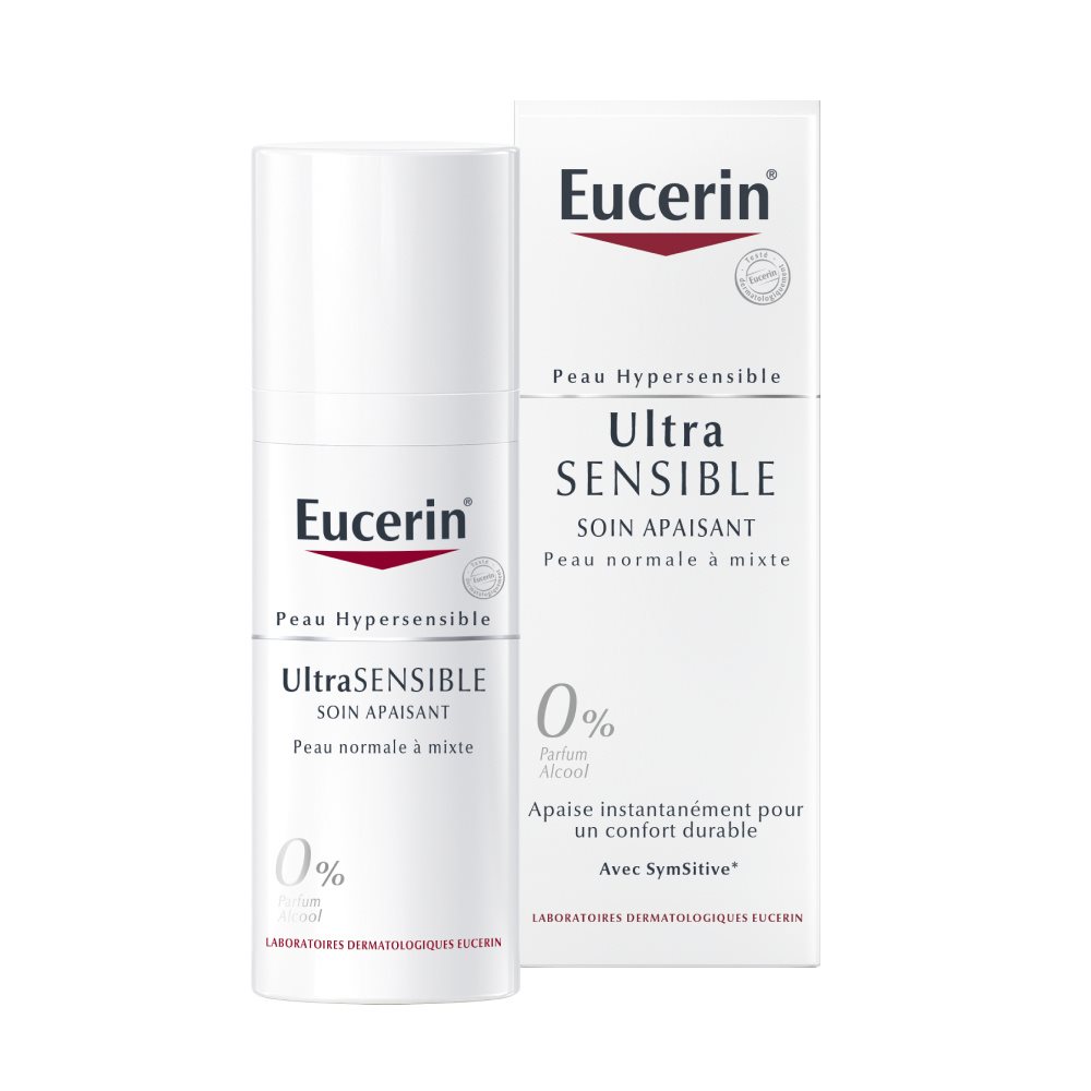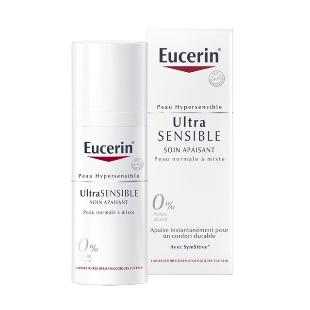 Le Soin Apaisant Eucerin UltraSENSIBLE pour Peau Normale à Mixte est recommandé pour une peau hypersensible, dont les principaux signes sont des sensations désagréables mais sur laquelle il n'y a pas de rougeurs visibles.