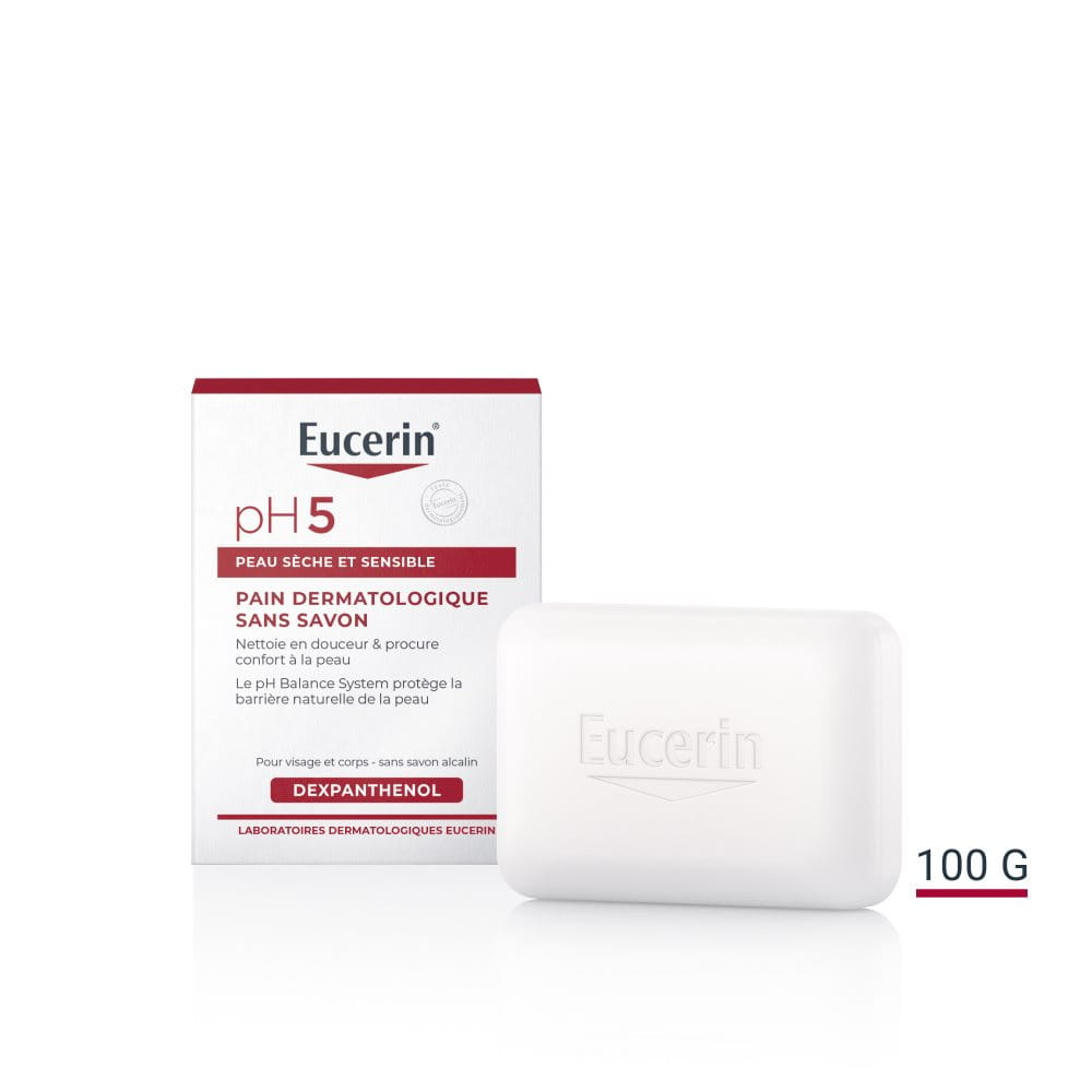 Tous les produits nettoyants de la gamme Eucerin pH5 ont été développés spécifiquement pour allier un nettoyage doux et d'excellentes propriétés de protection de la peau à une tolérance cutanée cliniquement prouvée. Le Pain Dermatologique Sans Savon pH5 Eucerin convient pour un usage fréquent, même sur la peau normalement intolérante au savon.