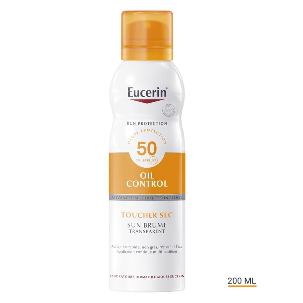 La lumière UV est la cause principale des dommages induits par le soleil, mais la lumière visible de haute énergie (HEV) peut aussi générer des radicaux libres, responsables d’un stress supplémentaire pour la peau. Eucerin Sun Brume Corps Toucher Sec Oil Control SPF 50 est un spray solaire pour le corps qui convient pour la peau sensible, même la peau à tendance acnéique. La technologie Advanced Spectral Technology combine des filtres UVA/UVB photostables et à large spectre pour une haute protection UV à de la Licochalcone A pour neutraliser les radicaux libres générés par les rayons UV et la lumière HEV. Le spray aérosol multiposition facilite une application rapide du produit sur les zones de peau difficiles d’accès. Le spray transparent et non gras est absorbé rapidement, rafraîchit la peau et est résistant à l’eau. Sun Brume Corps Toucher Sec Oil Control SPF 50 a fait l’objet de tests cliniques et dermatologiques qui ont prouvé qu’il convient à la peau sensible, même la peau à tendance acnéique.