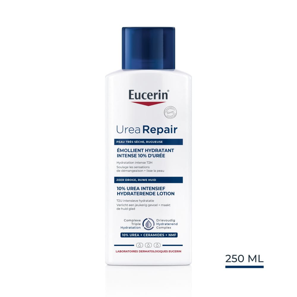 L'Émollient 10% d’Urée UreaRepair PLUS d'Eucerin procure à la peau très sèche, rugueuse du corps le soin quotidien dont elle a besoin. Elle contient une combinaison unique d'ingrédients – Urée, Céramide et autres Facteurs Naturels d’Hydratation (NMF) – qui fixent l'eau et aident à renforcer la barrière protective naturelle de la peau en la protégeant d'une perte d'eau supplémentaire. Il a été cliniquement et dermatologiquement prouvé que la formule procurait un apaisement immédiat et une hydratation intense et durable, retardant de 48 heures toute sensation de dessèchement et de rugosité. La peau est hydratée intensément et elle est souple et douce au toucher.